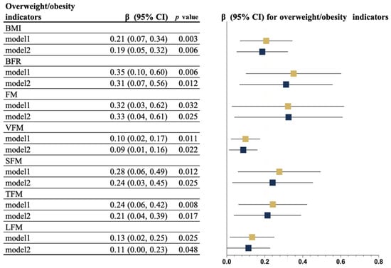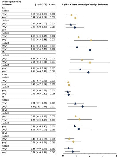 | MVPA (h/day) | 0.47 (0.27–0.68) | 0.49 (0.30–0.71) | 0.45 (0.25–0.66) | 0.48 (0.26–0.71) | 0.039 |