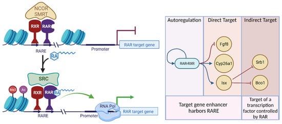 Transcriptional mechanism of RAR-RXR. RAR-RXR binds RARE element found in enhancer regions of target genes. Binding of RA to RAR-RXR causes the dissociation of co-repressors such as NCOR/SMRT and associated HDAC enzymes, and the recruitment of co-activators such as SRC which include HAT and histone methylase enzymes. Conversely, binding RA allows for ligand-induced repression of certain targets by RAR. Chromatin opening allows the initiation of transcription by RNA polymerases. RAR-RXR can control the expression of its own encoding genes (Rara, Rarb, Rarg) or direct target genes that harbor a RARE. Many retinoid-responsive genes are also controlled indirectly via intermediary RA-responsive transcription factors. Created with BioRender.com (accessed on 16 February 2022).