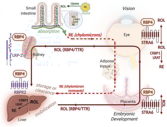 The absorption and delivery of vitamin A. Vitamin A is absorbed from the lumen of the small intestine following hydrolysis of retinyl esters (RE) and re-esterification of retinol via cellular retinol binding protein 2 (CRBP2) and lecithin:retinol acyltransferase (LRAT). REs are secreted by enterocytes as part of chylomicrons and circulate via the lymphatic system (green) and enter the circulation (dashed red). Chylomicrons are hydrolyzed via lipoprotein lipase (LPL) to deliver retinol to target tissues such as the eye, adipose tissue and placenta and return to be cleared by the liver as remnants. Liver stores retinol as RE in HSC through the action of LRAT. When needed hepatic stellate cells (HSC) hydrolyze RE and secrete retinol bound to retinol binding protein 4 (RBP4) in association with transthyretin (TTR) in the circulation. RBP4 can both deliver as well as take up retinol from tissues that express its receptor stimulated by retinoic acid 6 (STRA6). RBP4 is reabsorbed from the proximal tubule of the kidney via lipoprotein receptor-related protein 2 (LRP-2 or megalin)–cubilin complex. A hepatic RBP4 receptor RBPR2 may also play a role in the uptake of RBP4 by the liver. During fasting the liver can also secrete RE in conjunction with VLDL as an alternate means to mobilize retinol (not shown). Created with BioRender.com (accessed on 16 February 2022).