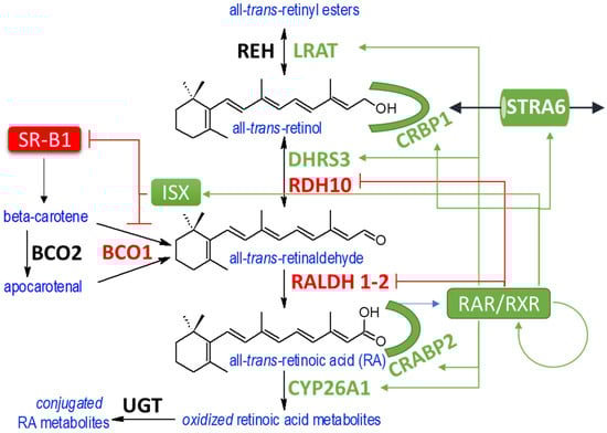 In conclusion, there is clear evidence for powerful feedback mechanisms that operate via RA–RAR/RXR and which act on retinoid enzymes, binding proteins, and transporters. The molecular mechanisms of RA feedback regulation are starting to emerge for some pathways such as ISX []. At the same time, as seen in studies using time-series transcriptomics in tractable models such as Xenopus [], feedback regulation is both dynamic and complex. Future directions in this research could involve both exploring the molecular mechanisms of vitamin A homeostasis and seeking to gain more insight in the inter-organ dialogue required to maintain vitamin A homeostasis.