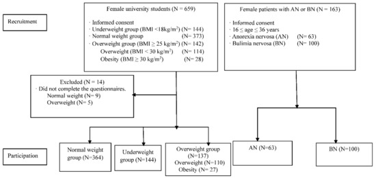 As shown in Figure 1, a total of 808 young women participated in the study, which consisted of university students (364 participants with NW, 144 with UW, and 137 with OW) and 163 patients with ED (63 patients with AN and 100 patients with BN).