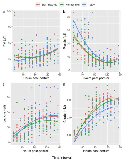 Polynomial curve fitting showed the changes in concentration of fat, protein, and lactose over time postpartum in each group were similar. However, citrate rose more quickly in both the BMI-matched and normal-BMI groups compared with the type 2 diabetes group (BMI-matched vs. type 2 diabetes, p-value = 0.001; normal-BMI vs. type 2 diabetes, p-value < 0.001 (Figure 1).