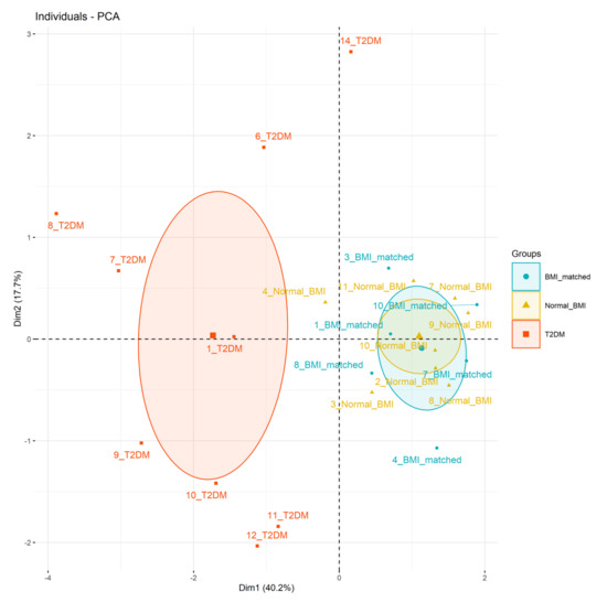 Principal components analysis (Figure 2) showed the type 2 diabetes group clustered separately from the BMI-matched and normal-BMI groups (Figure 2). Principal components 1, 2, and 3 had eigenvalues >1, accounting for 40%, 18%, and 16% of overall variance, respectively. The main factors in each principal component were 1: infant hypoglycaemia, hospital formula use, and citrate concentration at 72 h; 2: protein and lactose concentrations at 72 h; and 3: fat content at 72 h (Supplementary Table S7).