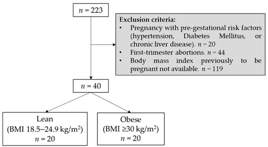 The comparison group was considered a pre-gestational BMI in the range 18.5–24.9 kg/m2 (lean group). We included 20 pregnancies in lean group, homogeneous in the maternal age and ethnicity, and having parity to avoid potential confusion factors (Figure 1).