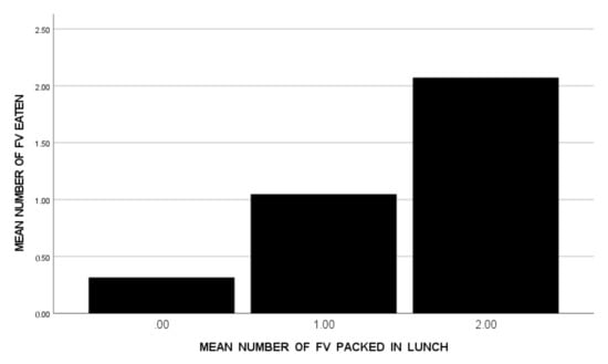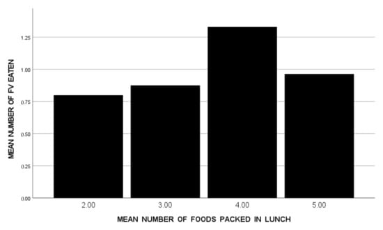 Although, overall, there was a strong correspondence between foods packed and foods consumed in the lunches packed and analyzed for this study, the closer examination of the number of foods packed for lunch and the number of FVs packed for lunch for their association with mean FV consumption suggests that caregivers who may be interested in having their children consume more FVs during school meals may benefit from guidance on which, and how many foods to include in their children’s packed lunches. The simple suggestion of initially selecting a fruit and/or vegetable (perhaps chosen from those most accepted) and then selecting only two or three additional foods may increase the probability that the child will consume the fruit or vegetable. Even though interventions to improve diet quality of school lunches have generally been shown to have a positive impact, especially on the presentation of vegetables [11,12,13], these interventions, to date, have been far more complicated than limiting the number of foods included in the packed lunch. If a parent has been supplying five or more foods in the packed lunch, an intervention simply limiting lunch to a fruit or vegetable and two or three additional foods would decrease the parent’s response effort, perhaps improving both the acceptability and maintenance of the intervention.