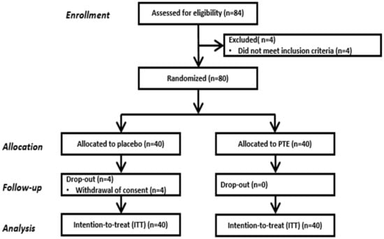 This study was a randomized, double-blind, placebo-controlled clinical trial. The study was performed as per the Declaration of Helsinki and the International Conference on Harmonization Guidelines for Good Clinical Practice. The study protocol was approved by the H&Bio SRC Institutional Review Board (IRB No. HBABN01-200814-HR-0073-02). Written consent was obtained in advance from all subjects. After suitability screening, the study subjects were randomly assigned to either the control group or the PTE intake experimental group. Subjects took the test material for 12 weeks. Participants were assigned to the regimens at a 1:1 ratio using a computer-generated randomization schedule. We used stratified block randomization to achieve balance among the groups using a block size of 2~8. Both study subjects and investigators were kept double-blind. Each study subject assignment code was sealed and stored in a single opaque envelope, which was designed to be opened only in a medical emergency. A total of 5 visits were scheduled: at week 3 (screening), week 0 (randomization and baseline measurement), week 4, week 8, and week 12.