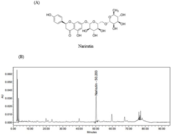 Active compound contained in PTE (A) and a HPLC chromatogram (B) of narirutin from PTE.