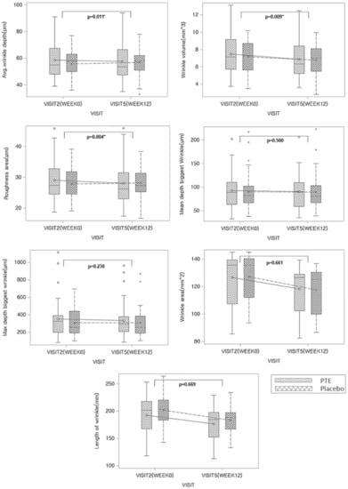 Change from baseline values of skin wrinkles on the crow’s feet during PTE treatment. p-value by independent t-test; * p < 0.05, ** p < 0.005.