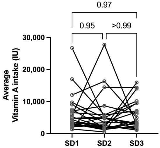 Prenatal vitamin supplements were taken by 87% of participants at SD1 (25–28 weeks gestation) and 57% reported supplementation in the postpartum period. No participants supplemented with vitamins containing vitamin A between SD2 and SD3 in accordance with the study. The geometric mean daily dietary intake of Vitamin A was 4790 IU (IQR 2956; 7280 IU), 3620 IU (IQR 1776 IU; 5463 IU), and 4372 IU (IQR 2689 IU; 8240 IU) on SD1, SD2 and SD3, respectively. There was no statistical difference in the vitamin A intake on SD1 compared to SD2 (p = 0.95), or on either SD1 (p = 0.97) or SD2 (p > 0.99) when compared to the matched SD3 (postpartum) (Figure 1). However, four (17%) and nine (39%) participants on SD1 and SD2, respectively, did not meet the recommended intake of vitamin A of 770 μg of retinol equivalents [12] (or ~2564 IU vitamin A). On SD1, only 1 of the 4 participants with low vitamin A intake reported no prenatal vitamin use. In addition, 57% of lactating participants did not meet the recommended daily intake of 1300 μg of retinol equivalents [12] or 4329 IU.