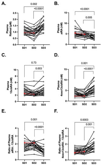 The plasma retinoid ((A) retinol (B) atRA (C) 13cisRA (D) 4oxo13cisRA) concentrations are altered in normal healthy pregnancies (n = 23) at 25–28 weeks gestation (SD1) and 28–32 weeks gestation (SD2) compared to 3–4 months PP (SD3). The ratio of (E) atRA to 13cisRA was higher during pregnancy while the ratio of (F) 4oxo13cisRA to 13cisRA was lower during pregnancy. In each analysis, one subject was excluded from the statistical comparison due to insufficient sample quantity in SD3 (red symbols).