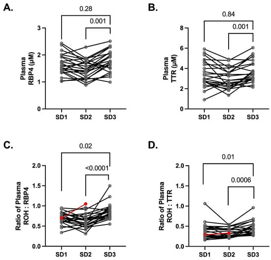 The plasma (A) RBP4 and (B) TTR concentrations at 25–28 weeks gestation (SD1), 28–32 weeks gestation (SD2), and 3–4 months PP (SD3) were measured from 23 healthy pregnant women. The ratio of (C) retinol to RBP4 and (D) retinol to TTR were lower on both SD1 and SD2 in comparison to SD3. In panels C,D, one subject had insufficient sample to measure SD3 retinol concentrations (red symbols) and was excluded from the statistical comparison (n = 22 pregnant women).