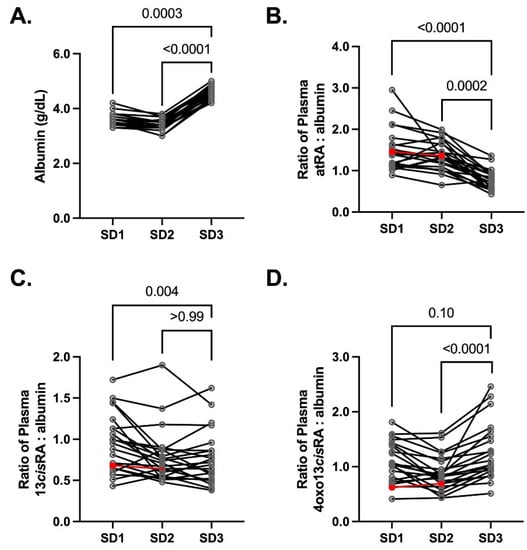Plasma (A) albumin was measured on each study visit during 25–28 weeks gestation (SD1), 28–32 weeks gestation (SD2), and 3–4 months PP (SD3). Plasma retinoid concentrations were normalized to the albumin concentration and shown as a ratio in (B–D). In panels B–D, one subject was excluded for statistical comparisons due insufficient sample for SD3 retinoid concentrations (red symbols) (n = 22 pregnant women).