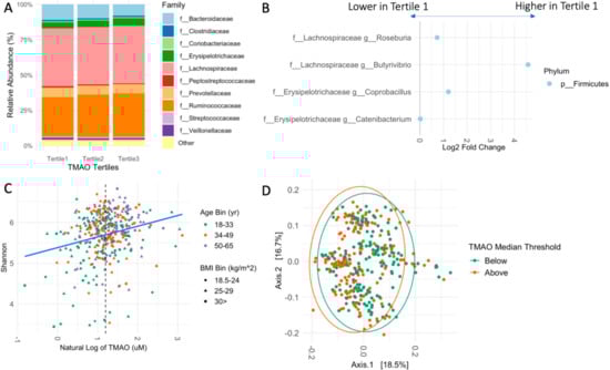 Fecal microbiome relates to fasting plasma TMAO in a generally healthy cohort. (A) Relative abundance of the top 10 most abundant families by TMAO tertile. (B) Genera that are differentially abundant between the low (TMAO 0.44–2.77 μM) and high TMAO tertile (TMAO > 3.91 μM). Graph is relative to the low group such that points to the right of 0 are more abundant in the low tertile. (C) Alpha diversity is directly related to fasting plasma TMAO (Shannon diversity, β = 0.17, p < 0.001). Point colors represent age bin and shape represents BMI bin. (D) Compositional differences are identified between individuals with TMAO less than and greater than 3.32 μM (Unweighted UniFrac, p = 0.001).