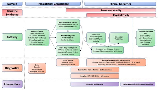 Geroscience conceptual model. Proposed pathways of exploration using translational geroscience (e.g., biological pathways) and clinical geriatrics (e.g., functional assessments and imaging) to identify sarcopenic obesity and physical frailty and develop targeted interventions for mitigation.