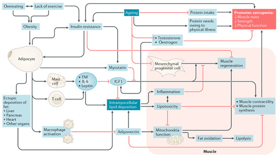 A proposed model of mechanisms leading to sarcopenic obesity. The proposed interplay between adipose and muscle tissue, which is believed to contribute to the development of sarcopenic obesity, is shown. The black lines are stimulatory, while red lines with flat ends indicate inhibition. IGF1, insulin-like growth factor 1; TNF, tumor necrosis factor [10].