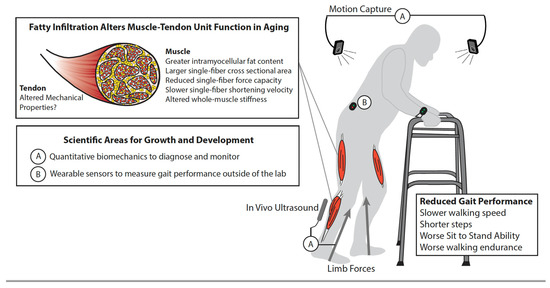 Multi-scale biomechanics and gait performance. Schematic illustrates the musculoskeletal cascade from the accumulation of intramuscular fat to reduced gait performance among older adults. This is also simultaneously emphasized, and discussed in the narrative: (A) the need for quantitative biomechanics to objectively diagnose and monitor the salient features of gait quality, including step length, width, and frequency, ground reaction forces, joint mechanics and energetics, and patterns of muscular recruitment in people with sarcopenic obesity, and (B) the evolution and widespread adoption of wearable sensors that continue to break down barriers to clinical translation.