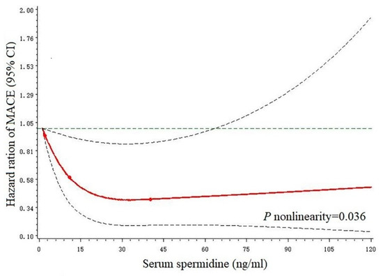 In Figure 1, we used restricted cubic splines to flexibly model and visualize the relationship between predicted spermidine and MACE. The risk of MACE decreased rapidly afterward until around 30 ng/mL of predicted spermidine levels and then started to relatively flat (p-nonlinearity = 0.036). A faint J-shaped association between spermidine levels and the risk of MACE was observed.