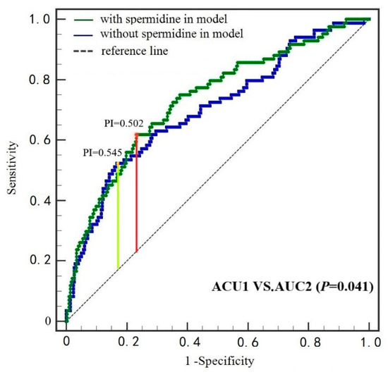 Receiving operating characteristics curves for MACE from Cox proportional hazards models with and without spermidine in patients with AMI (n = 377). In the model with spermidine, the optimal cut-off value for PI was 0.502 at Youden’s index of 0.387, shown in red. In the model without spermidine, the optimal cut-off value for PI was 0.545 at Youden’s index of 0.357, shown in yellow. Comparison between the AUCs is noted in the bottom panel. MACE: major adverse cardiac events, AMI: acute myocardial infarction, PI: prognosis index, AUC: areas under the curves.
