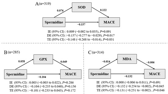 We did not find any significant associations between SOD, GPX, MDA, and MACE. Non-significant relationships were found between SOD, GPX, MDA, and spermidine levels (all p ≥ 0.05, data not shown). Figure 3A–C demonstrated the direct, indirect, and total effect of spermidine levels on MACE risk through SOD, GPX, and MDA, respectively. The standardized negative direct effect of spermidine though SOD and MDA on MACE was [−0.157 (−0.277–−0.029), p = 0.017] and −0.132 (−0.254–−0.002), p = 0.045], respectively. No statistical significance was found in the standardized negative direct effect of spermidine on MACE though GPX [−0.104 (−0.235–0.040), p = 0.156]. There was a marginal statistical significance in standardized positive indirect effect through SDO for spermidine on MACE [0.009 (−0.002–0.035), p = 0.091]. Non-significant indirect effect through GPX or MDA was detected. The standardized negative total effect of spermidine on MACE though SOD, GPX, and MDA was [−0.148 (−0.268–−0.014), p = 0.031], [−0.101 (−0.233–0.043), p = 0.172], and [−0.131 (−0.251–−0.002), p = 0.046], respectively.