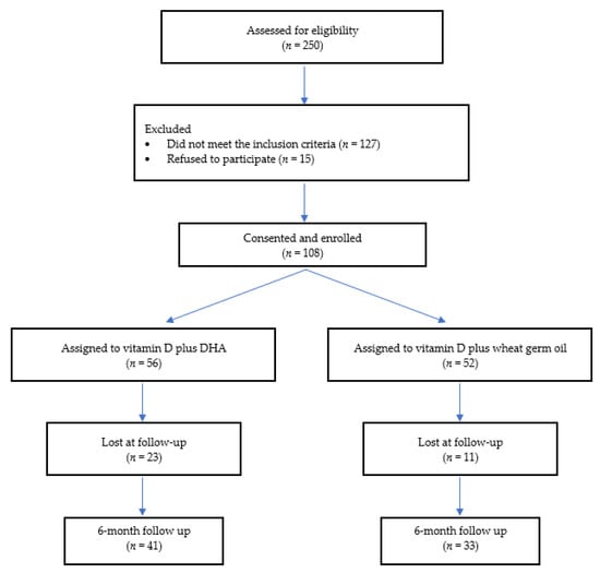 Assuming an increase of vitamin D levels of 40% and 55% in the group receiving vitamin D plus wheat germ oil and in the group receiving vitamin D plus DHA, respectively, and the possibility of some dropouts (approximately 10%), a sample size of 108 children is necessary to achieve a power of 80% with a 95% significance level. Data distribution was checked for normality by the Kolmogorov–Smirnov test. Continuous variables were expressed as mean ± SD or as median and interquartile range (IQR). Categorical data were expressed as absolute and relative frequency. Data were analyzed using the per-protocol principle and the values recorded at baseline were compared to values recorded at 6 months. Baseline and follow-up characteristics were tested for differences by Student’s t-test or Mann–Whitney test, as appropriate. The change of anthropometric and laboratory values between baseline and 6 months was evaluated using the Wilcoxon test for repeated measures. Difference between proportions were tested using the chi-squared test. Delta differences (∂) between the start and the end of treatment were calculated as ∂ = [(T1−T0)/T0] × 100. Univariate correlations were investigated with Spearman’s rank correlation test. Logistic regression analysis was used to test the independence of associations between vitamin D levels (≥20 ng/mL vs. <20 ng/mL) at the end of the study and the interventional group, DHA levels, and anthropometric variables. Missing data were handled using complete case analysis. Significance was assumed for p < 0.05. The data were analyzed using SPSS (Statistical Package for Social Science v.20 Inc., Chicago, IL, USA).