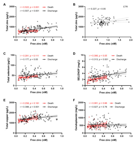 Free zinc in relation to total zinc and biomarkers of selenium and copper status in sera from COVID-19 patients. COVID-19 serum samples are separated and color-coded into patients that had died from COVID-19 (red, denoted as “Death”), and those who had survived (black symbols, “Discharge”). Free serum zinc concentrations were compared to (A) total zinc in COVID-19 patients, (B) total zinc in control subjects (CTR), (C) total Se in patients, (D) serum SELENOP in patients, (E) total serum copper concentrations, and (F) serum ceruloplasmin concentrations. Spearman correlation coefficients (r) and p values are indicated.