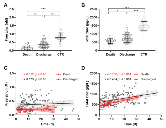 Dynamics of free serum zinc and total serum zinc during COVID-19. (A) Free zinc and (B) total zinc concentrations in sera of COVID-19 patients, separated with regard to patients that survived (“Discharge”) or died (“Death”), in comparison to serum of healthy controls (CTR). Scatter plots depict changes in (C) free and (D) total serum zinc concentrations over time during hospital stay. Data are presented as means ± SD, and significant differences are indicated (Kruskal–Wallis test followed by Dunn’s multiple–comparison test (* p < 0.05; ** p < 0.01; *** p < 0.001) (A,B)), and as scatter plots (C,D), including Spearman correlation coefficients (r) and p values. Data presented in (B) are shown for comparison and were published previously [15].