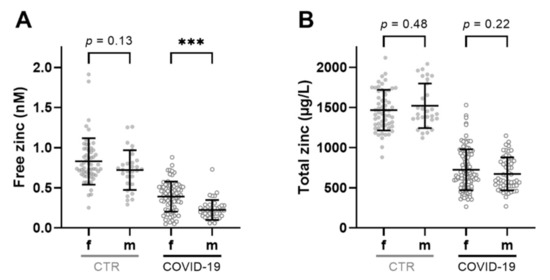Impact of sex on free and total serum zinc concentrations. (A) Free zinc and (B) total zinc concentrations in sera of male (m) and female (f) COVID-patients and CTR subjects. Data are shown as means ± SD, and comparisons were analyzed by Mann–Whitney U test (*** p < 0.001).