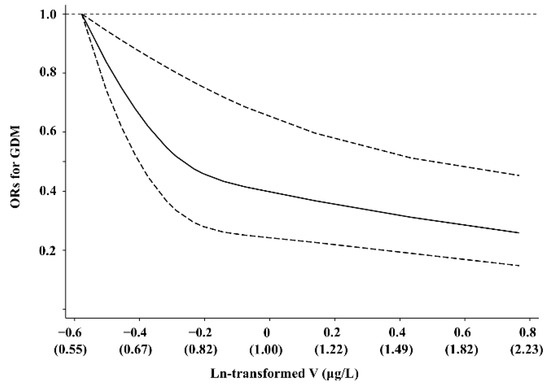 Previous studies on the relation between the levels of V and GDM are limited and yield inconsistent results. One case-control study reported that V exposure, reflected by meconium V concentrations, was negatively associated with GDM risk in 137 GDM cases and 197 controls [15], which was similar to our findings. In a prospective cohort study, Zhang et al. found that serum V had no statistically significant association with GDM, but inversely correlated with OGTT-1h (β = −0.09, p = 0.014) [12], which was partly consistent with our results. The participants in the current study had lower blood V concentrations (median (IQR): 0.73 (0.63–0.89) μg/L in GDM cases and 0.80 (0.70–1.11) μg/L in controls) than those in Zhang’s study (median (IQR): 1.96 (0.44–2.46) μg/L), which might contribute to the discrepancies in findings. In addition, an opposite result was observed in another Chinese cohort study, which reported that V exposure in early pregnancy was positively associated with GDM risk [11]. However, this study used urinary V levels as the exposure biomarker and we used blood concentrations. Due to the absence of evidence on the relationship between blood V and urine V, it is hard to compare these two results directly. Moreover, our findings were consistent with the results of studies focusing on T2DM among non-pregnant populations. A case-control study in the Chinese population, including 223 T2DM cases and 302 controls, reported that serum V was inversely associated with T2DM risk [16]. Similarly, another study including 802 T2DM cases and 796 controls indicated a negative relationship of plasma V concentrations with the odds of T2DM [10]. Furthermore, previous studies have shown that V intervention yielded beneficial effects on glucose metabolism in animal models with impaired glucose regulation [17,18] and patients with non-insulin-dependent diabetes mellitus [19]. Accordingly, our study provided convincing support to the assumption that V had a beneficial role in the control of glucose homeostasis.