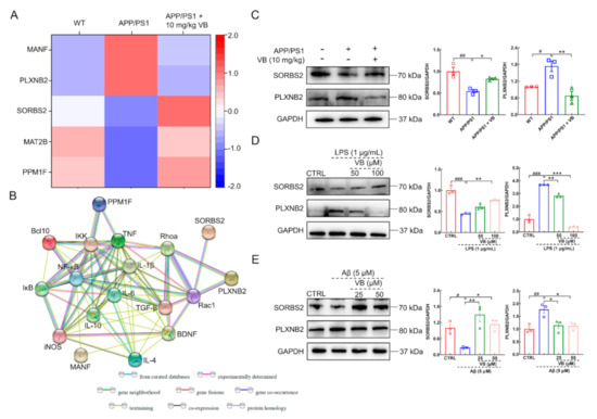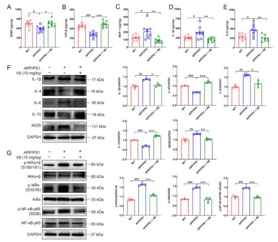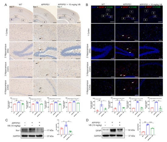 3.2. VB Mediates Anti-Neuroinflammatory Properties through Modulation of NF-κB-p65 Signaling in APP/PS1 Mice