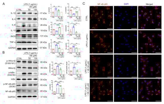 3.3. VB Exerts Anti-Inflammatory Properties in LPS-Induced BV2 Cells by Regulating NF-κB-p65 Signaling