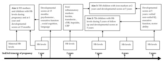 The aims of the current study were: (1) to assess the effect of maternal Hb levels and mild anemia during pregnancy, and Hb levels and moderate anemia in children at one year on developmental scores at 15 months; (2) to assess the effect of maternal and childhood Hb levels and any moderate anemia event at or below five years of age on developmental scores at five years of age; and (3) to assess the effects of ID and IDA at two years of age on developmental scores at five years of age (Figure 1).