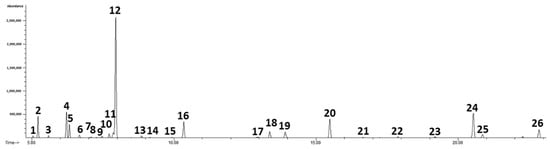 Chromatogram of volatile compounds of laurel essential oil (1 = α-thujene; 2 = α-pinene; 3 = camphene; 4 = sabinene; 5 = β-pinene; 6 = myrcene; 7 = α-phellandrene; 8 = 3-carene; 9 = α-terpinene; 10 = p-cymene; 11 = d-limonene; 12 = eucalyptol; 13 = γ-terpinene; 14 = cis-sabinene hydrate; 15 = α-terpinolene; 16 = linalool; 17 = δ-terpineol; 18 = terpinen-4-ol; 19 = α-terpineol; 20 = nerol (is); 21 = linalyl acetate; 22 = bornyl acetate; 23 = δ-terpinyl acetate; 24 = α-terpinyl acetate; 25 = eugenol; 26 = methyleugenol).