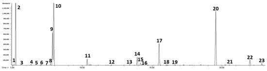 Chromatogram of volatile compounds of myrtle essential oil (1 = α-thujene; 2 = α-pinene; 3 = camphene; 4 = β-pinene; 5 = myrcene; 6 = α-phellandrene; 7 = 3-carene; 8 = p-cymene; 9 = d-limonene; 10 = eucalyptol; 11 = linalool; 12 = camphor; 13 = terpinen-4-ol; 14 = α-terpineol; 15 = myrtenol; 16 = estragole; 17 = nerol (is); 18 = carvone; 19 = geraniol; 20 = myrtenyl acetate; 21 = α-terpinyl acetate; 22 = geranyl acetate; 23 = methyleugenol).