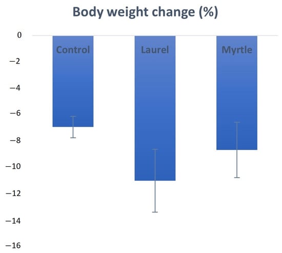 During the experimental period, no mortality was observed in the rats that were available for evaluation. The percentage of body weight change is shown in Figure 3, where a reduction in body weight is visible in the control as well as in the experimental groups, but without statistical significance. The highest percentage of change in the body weight of rats was caused by the application of laurel EO (−11.10%), followed by myrtle EO (−8.75%) and the control oil (−6.99).