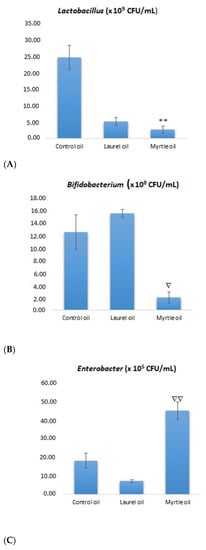Figure 4 depicts the fecal microbial count of rats after their treatment with EOs from laurel and myrtle. Interestingly, the number of Lactobacillus colonies was reduced in all experimental groups (laurel and myrtle) when compared to the control group as follows: 7.23 ± 1.26; 2.72 ± 1.11 (p < 0.01) vs. 24.88 ± 3.69 CFU × 109/mL. However, the number of colonies of Bifidobacterium increased in laurel EO treatment rats, while it decreased in rats treated with myrtle EO, if compared with the control group; the number of CFU × 108/mL was as follows: 15.85 ± 0.64, and 2.03 ± 0.92 vs. 12.78 ± 2.84. An unexpected situation was observed in the number of Enterobacteriaceae colonies; the treatment with myrtle EO induced a significantly higher CFU × 105/mL in relation to laurel EO (p < 0.05) and control, but without significance. The two-week treatment with laurel and myrtle EOs had no influence on fecal pH when compared to the control (Table 3).