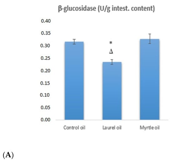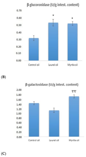 It is known that diet as well as a number of environmental factors and stress can affect the intestinal microbiome and have consequences on human and animal health. Thus, the consumption of high saturated and trans-fat diets is thought to increase the risk of cardiovascular disease through the up-regulation of blood total cholesterol and LDL-C [16]. On the other hand, health-promoting fats, such as mono- and polyunsaturated fats, are crucial in alleviating the risk of chronic disease. This study focused on changes in the total counts of Lactobacillus, Bifidobacterium and Enterobacter and on the specific enzymatic activity of the β-glucuronidase, β-glucosidase, and β-galactosidase derived from the intestinal flora of the rats after the application of myrtle and laurel EOs.