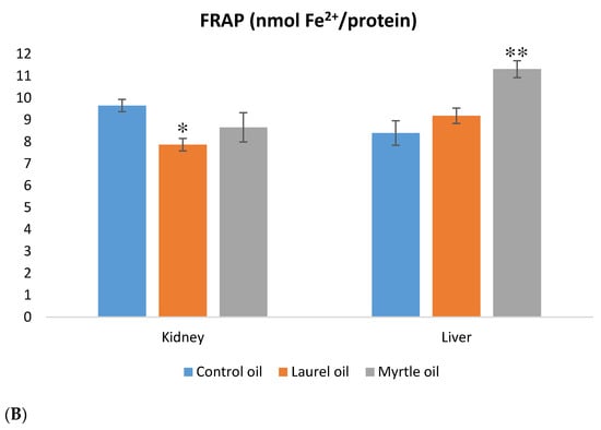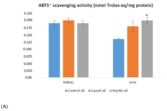 The antioxidant capacity of liver and kidney after treatment with laurel and myrtle EOs was assessed by the FRAP and ABTS method described in detail in [21]. Briefly, the freshly prepared FRAP reagent (1.5 mL) was mixed with 200 µL of water and 50 µL of the tissue sample or blank standard sample with 50 µL water, and incubated for 4 min at room temperature. The absorbance was recorded at λ = 595 nm with a Libro S22 spectrophotometer (Biochrom Ltd., Cambridge, UK) and the ferric-reducing ability of the liver and kidney tissue homogenate was calculated according to the standard curve and expressed as nmol Fe2+ per mg of protein in samples.