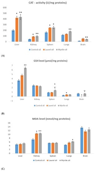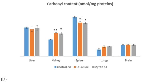 The antimicrobial activity of EOs shown in this study and also their antioxidant properties have been confirmed by many authors [2,4,5,6,7,42,43,44]. However, there are no data on their antioxidant capacity in tissues. Although in vitro assays are used for rapid screening, their results cannot be directly extrapolated to in vivo conditions. The rats as models are therefore used to simulate in vivo conditions for the evaluation of the antioxidant capacity of the used EOs. The antioxidant capacity of the liver and kidney rat tissues was confirmed by FRAP and ABTS free radical scavenging assays and by markers of tissue oxidative stress defense systems, such as MDA, GSH and CAT activity. The treatment with myrtle showed the best antioxidant capacity of the liver as indicated by the increased values obtained by the ABTS and FRAP analysis. In addition, an increase in the GSH and CAT activity levels was observed in almost all organs, except the GSH levels in the kidney, in which increased levels of MDA and carbonylated proteins were observed. The application of the laurel EO to rats also significantly increased the levels of MDA in the kidney and the CAT activity in the liver, kidney and spleen, when compared to the control. According to Kondratyuk and Pezzuto [56], the pH of biological tissues could also influence the antioxidative/pro-oxidative activity of phenolics compounds. In general, a decrease in pH increased iron-reducing activity and reduced the ability of phenolics to chelate and inhibit the catalytic activity of iron. Increasing pH increased deoxyribose and DNA oxidation. According to Harassi et al. [57] and Bouzabata et al. [58], the high concentration in oxygenated and hydrocarbon monoterpenes, methyl eugenol, eugenol, and, α-terpineol present in EOs or the absence of phenolic compounds might be responsible for the weak antioxidative activity in tissues. Thus, eugenol has been shown to have antioxidant activity in low concentrations, but it acts as a pro-oxidant in high concentrations. Monoterpene derivatives are the main compounds found in EOs, such as α-pinene, 1,8-cineole, linalool and linalyl acetate, while several hydrocarbons and oxygenated monoterpenes were present in smaller quantities, namely, limonene, α-terpineol, and geranyl acetate. According to the authors of [57,58], the weak antioxidant activity of methyl eugenol refers to the delocalized electron(s) or proton(s) of methyl eugenol.