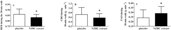 In conclusion, in recreationally active adult females, 7-day intake of NZBC extract substantially enhanced fat oxidation by 30 min of moderate-intensity walking exercise. The enhanced walking-induced fat oxidation by intake of NZBC extract in recreationally active females was body composition-dependent.