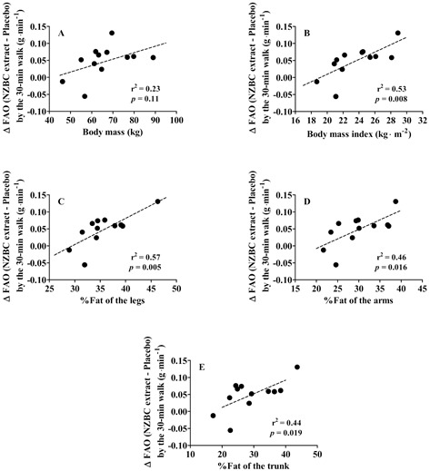 Relationship between body mass (A), body mass index (B), %fat of the legs (C), %fat of the arms (D), and %fat of the trunk (E) and the changes in fat oxidation (∆ FAO) by 30 min of moderate-intensity treadmill walking with intake of New Zealand blackcurrant (NZBC) extract. The ∆ FAO is the fat oxidation with intake of New Zealand blackcurrant extract minus the fat oxidation with intake of placebo. The dotted lines are the linear regression lines.