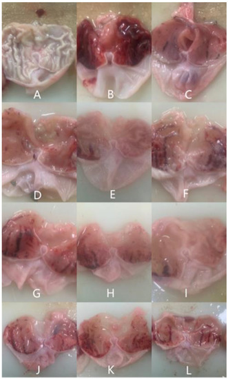 Macroscopic photo images of stomach tissue in rats. Blank group (A), Model group (B), Positive group (C), GLP100-H (D), GLP100-M (E), GLP100-L (F), GLP10-H (G), GLP10-M (H), GLP10-L (I), GLP1-H (J), GLP1-M (K), GLP1-L (L).