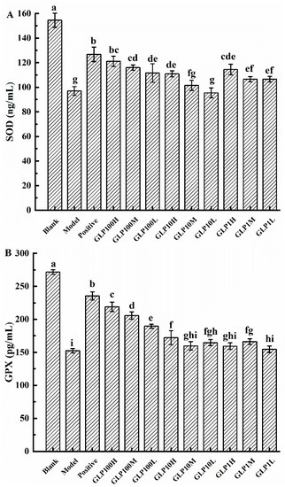 Effects of GLPs on SOD (A) and GPX (B) activities in rats. Different lowercase letters (a–i) indicate significant differences at p < 0.05.