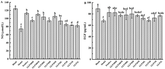 Effects of GLPs on the contents of NO (A) and EGF (B) in rats. Different lowercase letters (a–e) indicate significant differences at p < 0.05.
