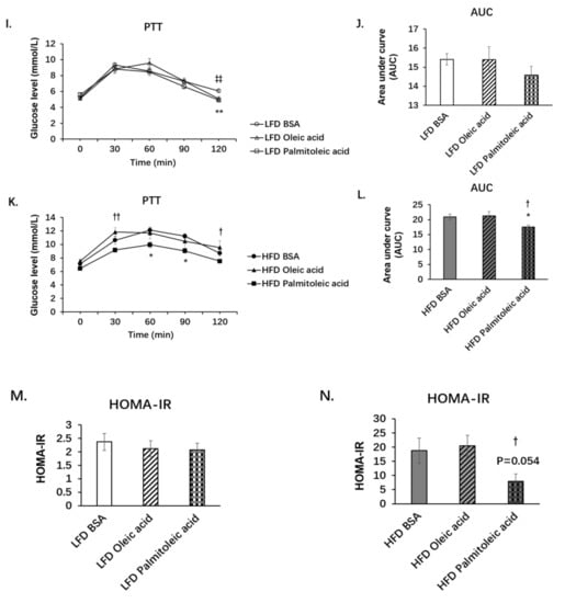Our previous study found that HFD-fed mice treated with palmitoleic acid had reduced HFD-induced liver insulin resistance and inflammation [8]. In this study, mice were fed with LFD or HFD for 12 weeks, then gavaged with BSA, oleic acid, or palmitoleic acid for 6 weeks. HFD significantly increased body weight, liver weight, and fat content in mice. Neither oleic acid nor palmitoleic acid significantly changed body weight, liver weight, or fat content in either LFD-fed mice or HFD-fed mice (data not shown). In LFD-fed mice, GTT revealed that palmitoleic acid significantly increased systemic glucose clearance compared to the BSA control or oleic acid treatment (Figure 1A,B). However, ITT (Figure 1E,F), HOMA-IR (Figure 1M), and PTT (Figure 1I,J) did not show differences among LFD groups. In HFD-fed mice, palmitoleic acid treatment resulted in statistically significant increases in systemic glucose clearance (Figure 1C,D) and an increase in systemic insulin sensitivity (Figure 1G,H), as well as a significant decrease in glucose production compared with the BSA and oleic acid groups (Figure 1K,L), indicating that reduction in hepatic gluconeogenesis might play a role in enhanced systemic glucose homeostasis by palmitoleic acid in obese mice.