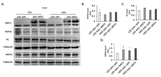 Examination of the expression of gluconeogenesis-related enzymes, such as PEPCK, PC, and MDH2 in the liver revealed that HFD significantly increased the expression of MDH2 (Figure 6A,D), but not the expression of PEPCK and PC (Figure 6A–C). Under both LFD and HFD feeding, SIRT3 overexpression did not change the expression of PEPCK and PC (Figure 6A–C). Under LFD feeding, SIRT3 increased the expression of MDH2, whereas under HFD feeding, SIRT3 also had a tendency to increase the expression of MHD2, although it was not statiscally significant (Figure 6D). These results showed that SIRT3 overexpression did not change the protein levels of PEPCK and PC, but increased the protein level of MDH2.