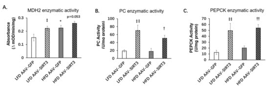 SIRT3 overexpression increases the activities of gluconeogenic enzymes. C57BL/6N male mice of 5–6 weeks of age were injected with AAV-GFP or AAV-SIRT3 via a tail vein and fed with LFD or HFD for 12 weeks. At the 14th week of feeding, mice were euthanized, and the liver tissues were collected. (A) Enzymatic activity of MDH2. (B) Enzymatic activity of PC. (C) Enzymatic activity of PEPCK. The data are mean ± s.e. (error bars). n = 4–7 mice per group *, p < 0.05, LFD AAV-GFP vs. HFD AAV-GFP; ‡, p < 0.05, ‡‡, p < 0.01, LFD AAV-GFP vs. LFD AAV-SIRT3; †, p < 0.05, ††, p < 0.01, HFD AAV-GFP vs. HFD AAV-SIRT3.
