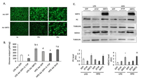 Adenoviral vectors Ad-GFP and Ad-SIRT3 (with the GFP) were used to infect primary hepatocytes. Primary hepatocytes from mice fed with HFD or LFD for 12 weeks were isolated and infected with adenoviruses. After infection, the efficiency was observed under a fluorescence microscope. After two days, the efficiency of adenovirus infection was significant (Figure 8A). A glucose production assay revealed that the glucose production of primary hepatocytes was reduced in the presence of the SIRT3 enzymatic activity inhibitor 3-TYP in primary hepatocytes from both LFD- and HFD-fed mice. SIRT3 overexpression increased glucose production in hepatocytes (Figure 8B). 3-TYP did not change the expression of SIRT3 but inhibited the enzyme activity of SIRT3. Neither SIRT3 inhibitor nor SIRT3 overexpression changed the protein levels of PEPCK (data not shown) or PC (Figure 8C). SIRT3 overexpression increased the protein level of MDH2 (Figure 8C).