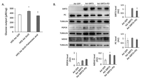 Palmitoleic acid reverses the increase in gluconeogenesis caused by SIRT3 overexpression in primary hepatocytes. Primary hepatocytes from mice fed with HFD were isolated and infected with Ad-GFP or Ad-SIRT3 adenovirus. Ad-SIRT3-infected hepatocytes were also treated with palmitoleic acid for 48 h. (A) Glucose production from primary hepatocytes. In the presence of substrates (20 mM lactic acid and 2 mM pyruvate), the primary hepatocytes were stimulated with 100 nM glucagon for 3 h to detect the content of glucose in the medium. (B) SIRT3, PC, and MDH2 protein levels were detected using Western blot analysis. The data are mean ± s.e. (error bars). n = 6 from three independent experiments. *, p < 0.05, HFD Ad-GFP vs. HFD Ad-SIRT3; †, p < 0.05 HFD Ad-SIRT3 vs. HFD Ad-SIRT3+PO (palmitoleic acid).