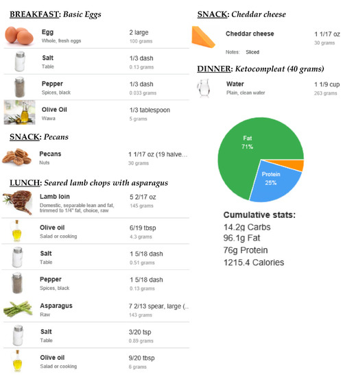Before starting the KMED, participants were counseled individually about the dietetic protocol that they would be expected to follow for four weeks. To guarantee that all 36 of the included participants consumed a similar diet, we developed two KMED meal plans, plan 1 (from day 1 to day 14) and plan 2 (from day 15 to day 28), assigning a precise quantity to individual foods using a piece of free online software (https://www.eatthismuch.com, (accessed on 10 January 2020)). Each ketogenic food plan (from 1150 to 1250 Kcal/day) consisted of 25% proteins, 4% carbohydrates, and 71% fats. An example is reported in Figure 1, whereas the composition of the supplement (Ketocompleat, MVMedical Solutions, Serravalle, Repubblica San Marino) is reported in Table 1 [10,12].