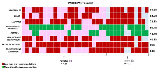 As shown in Figure 2, only 44.5% (16/36), 47.2% (17/36), and 27.8% (10/36) of the participants followed the preoperative indications for main meal portions of vegetables, fruits, and legumes, respectively, whereas all the other participants (more than half) did not. Furthermore, we found that 30.6% (11/36) and 55.6% (20/36) of participants followed the prescribed recommendations for carbohydrates/sweet products and alcohol, respectively. Furthermore, 61.1% (22/36) of participants reported experiencing new foods and new culinary preparations.